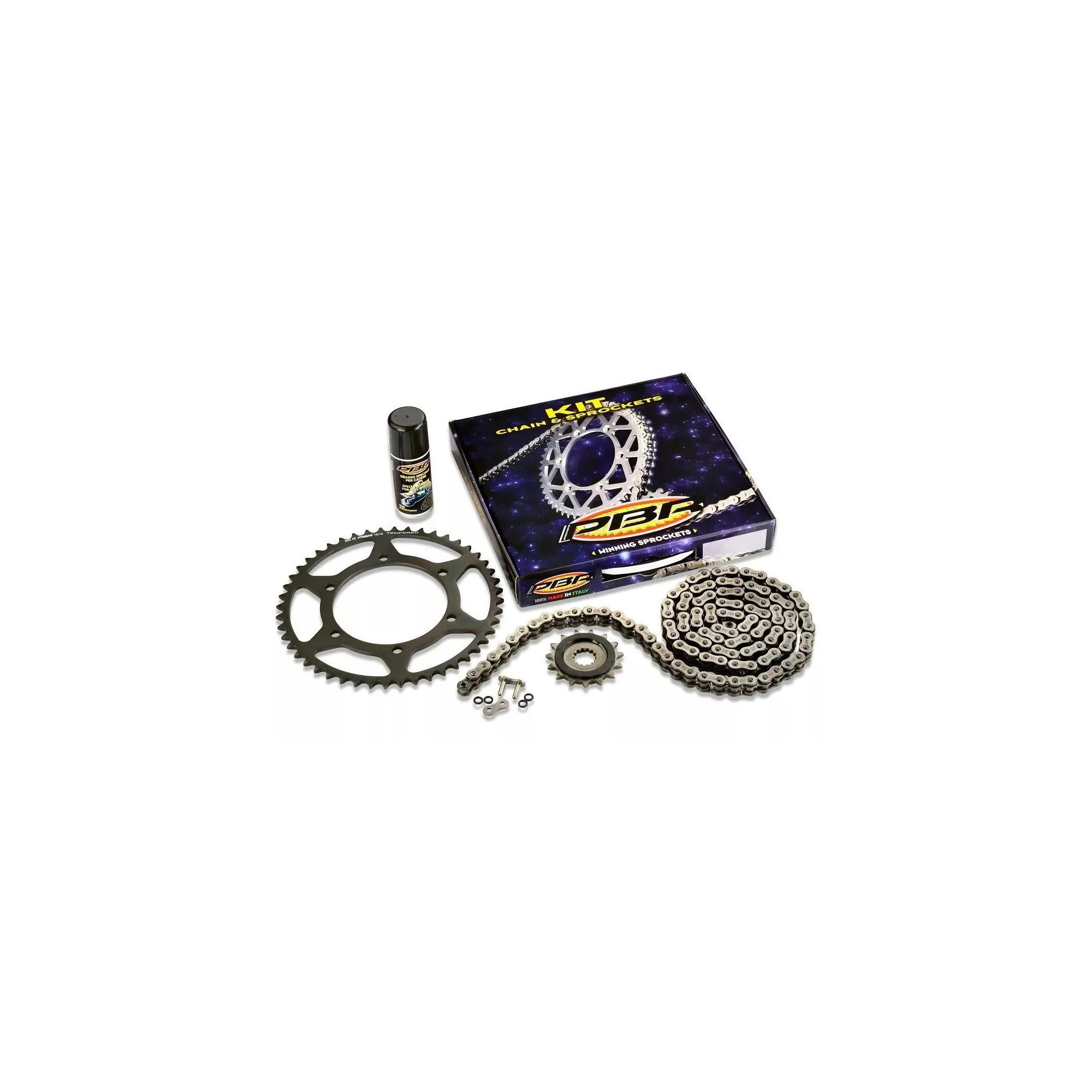 Kit enthält Ritzel Z15, Ritzel Z46, Kette EK 525 SRX-2 QX RING, Sprühfett 100ml