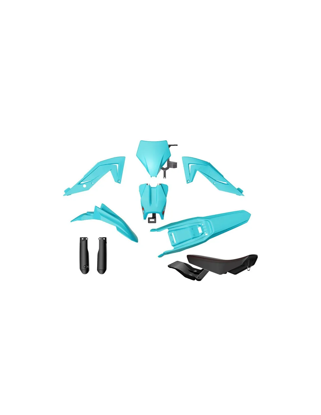 Bestehend aus zwei Verkleidungen, Tankabdeckung, zwei mittleren Seitenverkleidungen, zwei hinteren seitlichen Nummernschildverkleidungen, hinterem Kotflügel und Sitzbank.