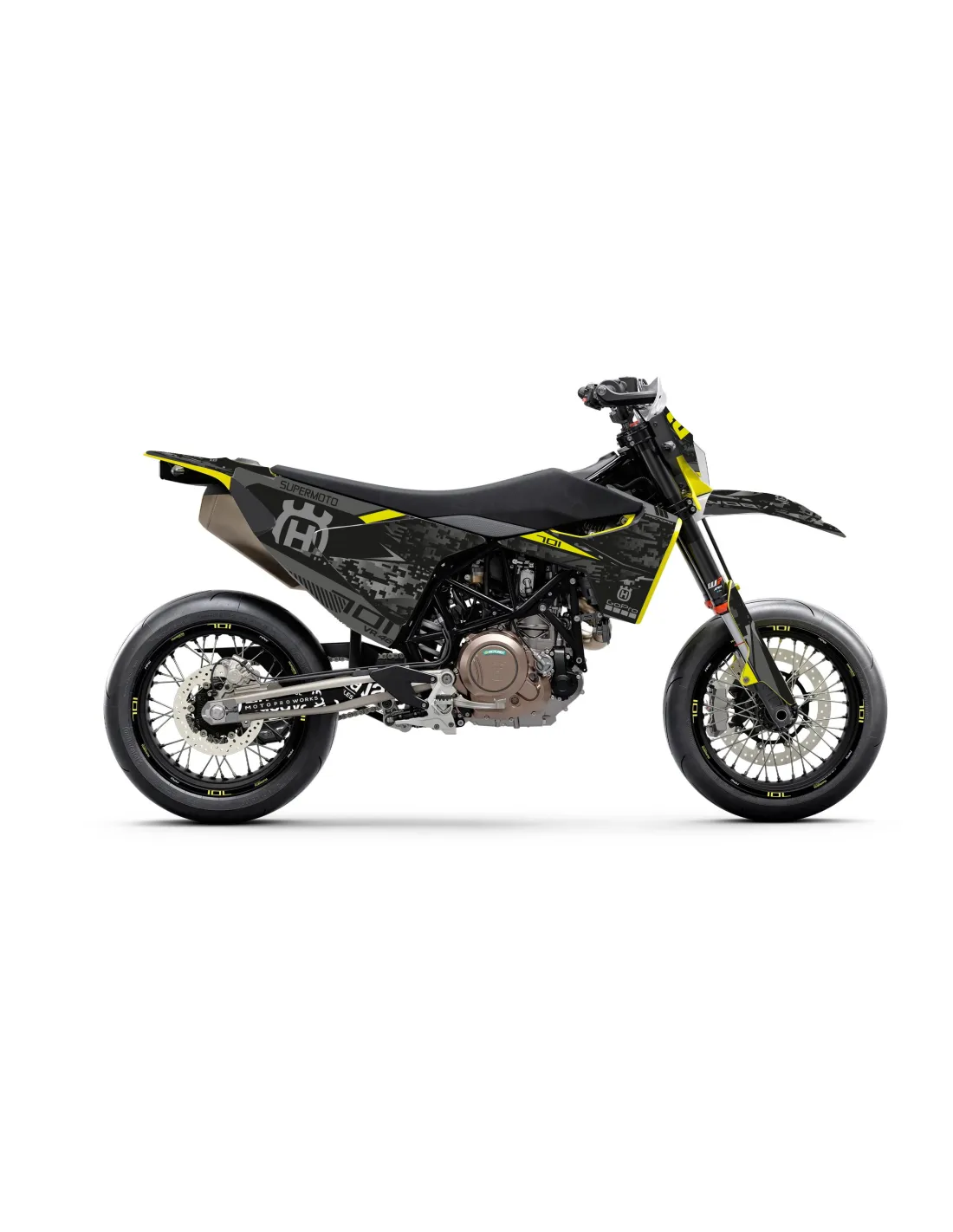 Le kit comprend : convoyeurs, garde-boue avant, garde-boue arrière, boîte à air, tableau avant, tableaux latéraux, protège-tiges, bras oscillant et, sur certains modèles, également le réservoir.