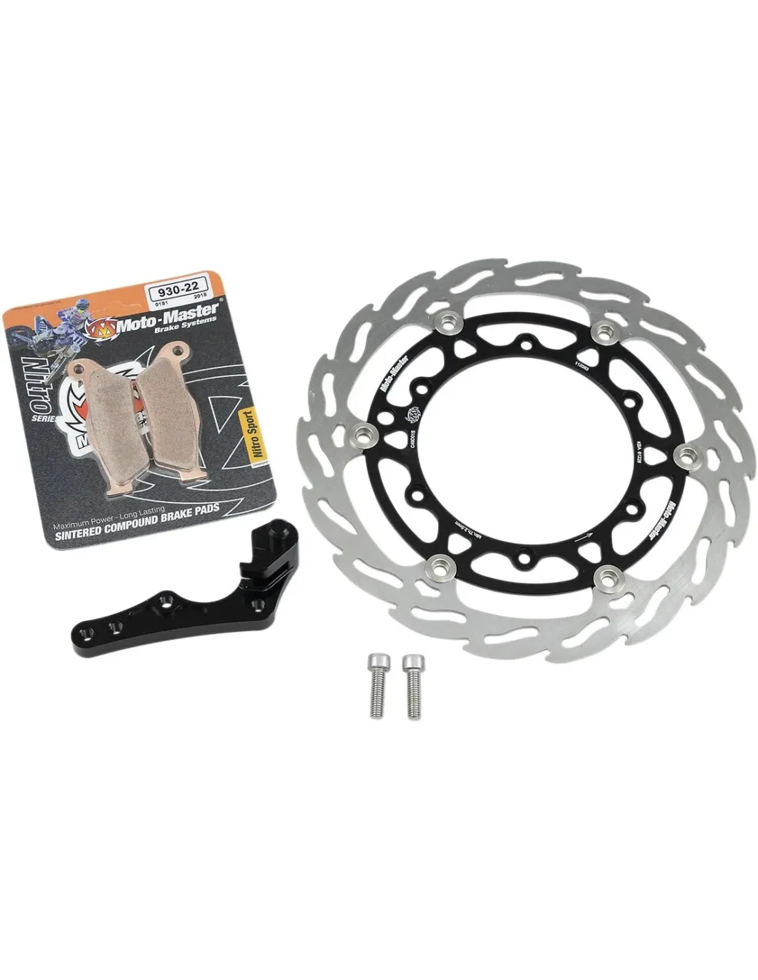 Le kit contient : un disque de frein surdimensionné de 270 mm, un adaptateur de repositionnement d'étrier et un kit de plaquettes de frein avant composées Racing Moto Master Nitro Sport