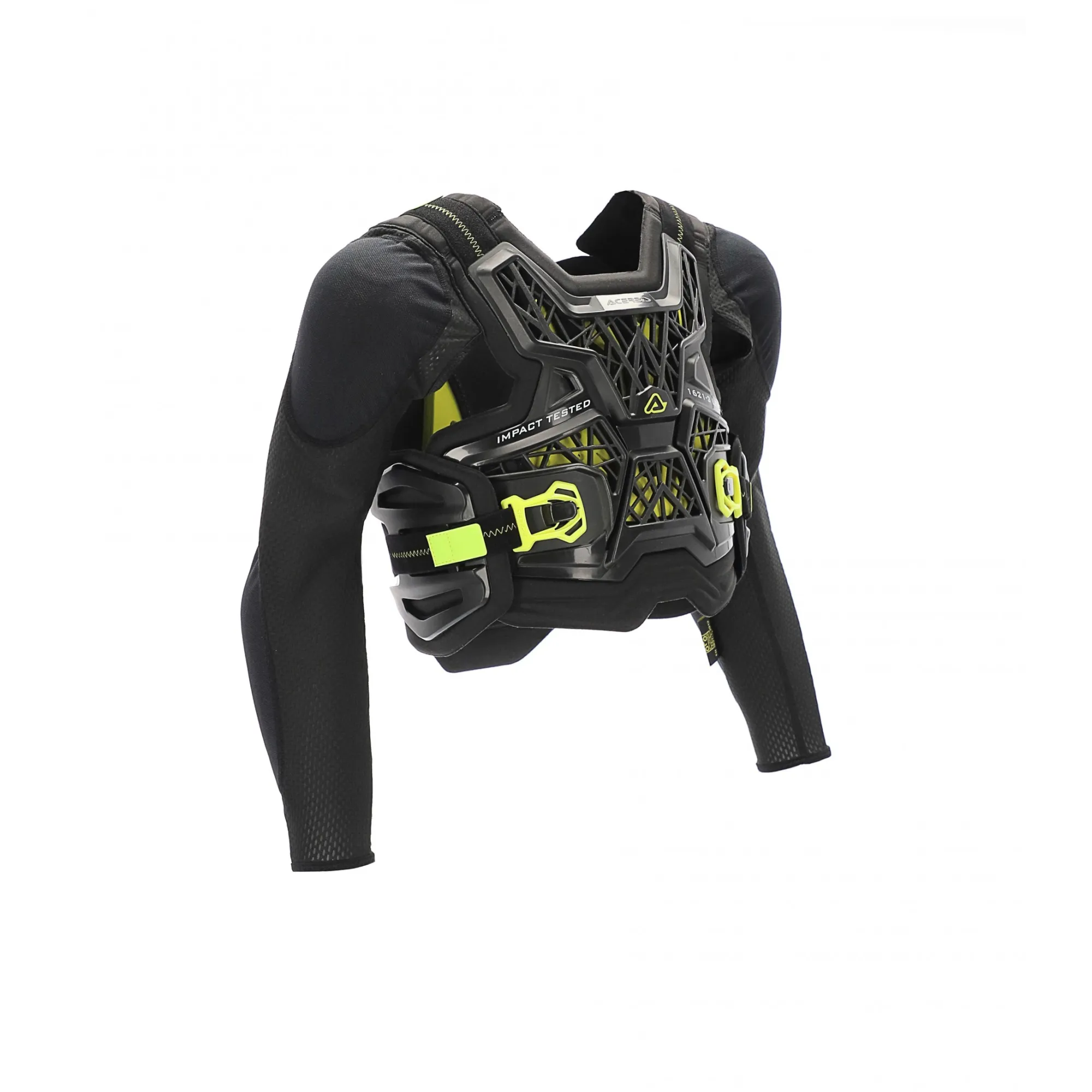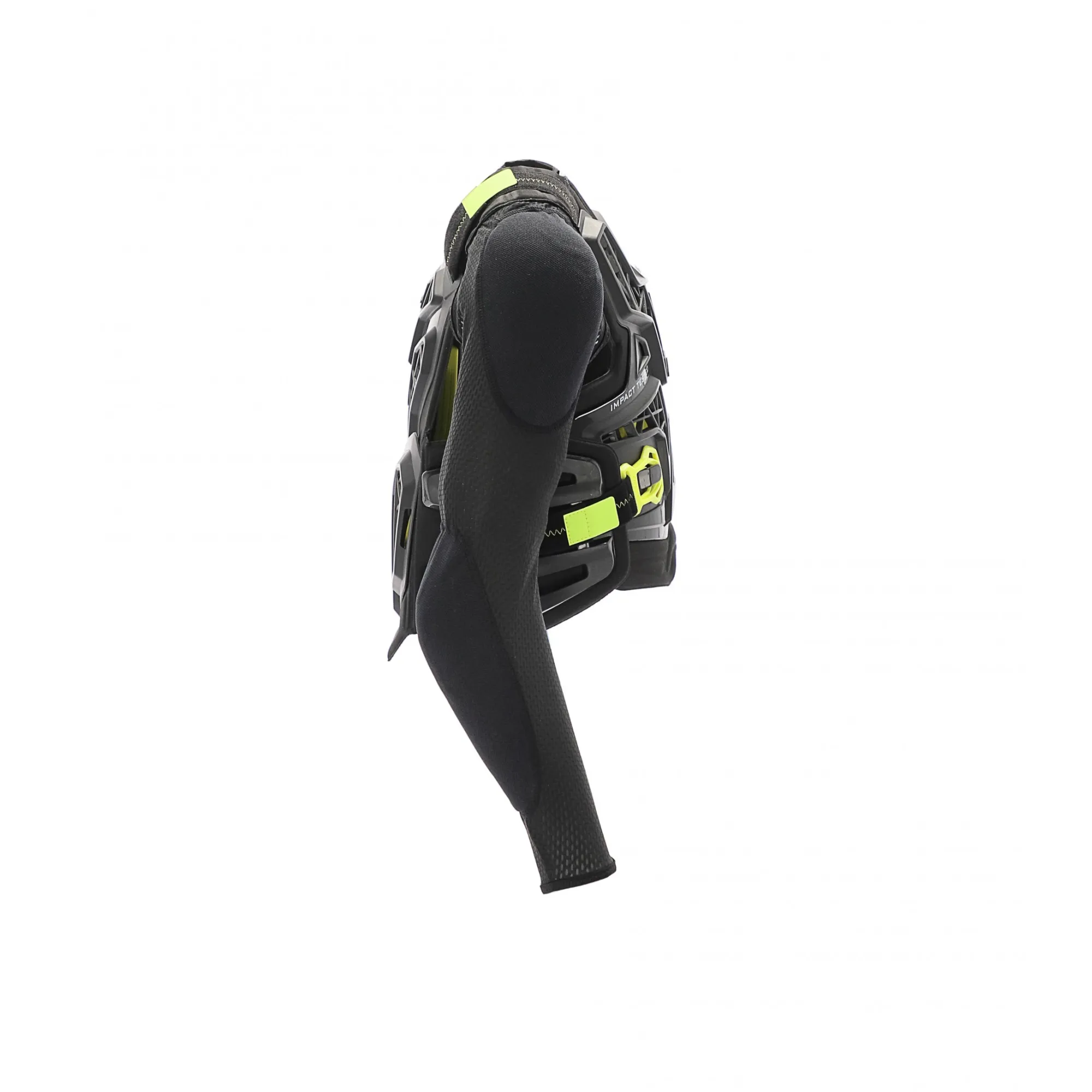 - L’innovativa costruzione unisce la leggerezza/areazione di una pettorina da cross e la protezione di un body armour: le protezioni spalle gomiti sono applicate a maniche di tessuto elastico traforato, studiato per garantire alta traspiabilità ed aderenza alle braccia. Le maniche stesse si fissano sugli spallacci imbottiti della pettorina, la quale lascia i fianchi liberi da tessuto per aumentare lo scambio termico e la traspirabilità