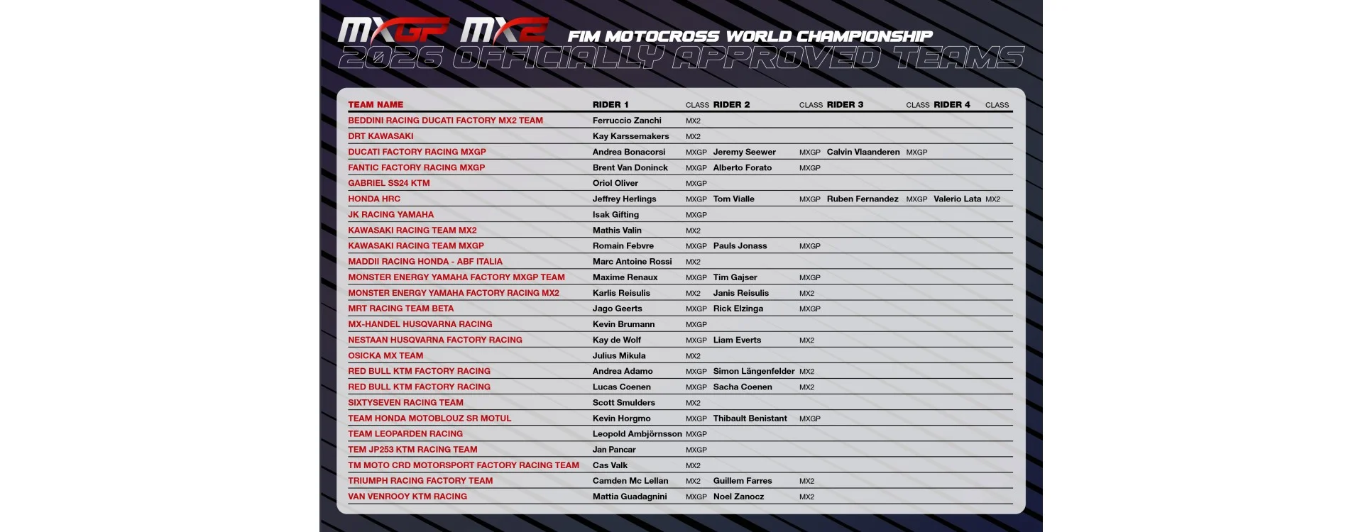 MXGP: Presentato l'elenco Ufficiale dei Team per la prossima Stagione